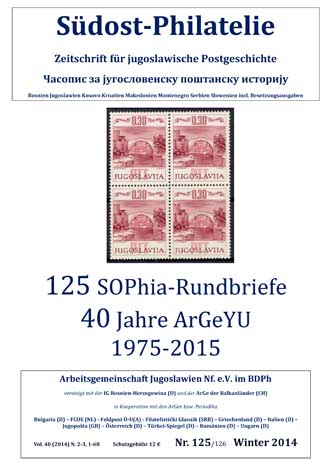 Die Südost-Philatelie (SOPhia) erscheint im Jahre 2024 im 50. Jahrgang. Bisher erschienen 150 Ausgaben mit knapp 4.000 Textseiten mit hunderten farbigen und (bis Nr. 111 über 1.000) schwarz-weißen postgeschichtlichen Abbildungen aus allen 10 Sammelgebieten der ArGeYU