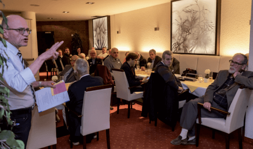 Abb. oben: Gesamtgruppe lauscht dem Jahresberichterstatter; rechts (oben) am Bildrand: Jan Billion, Freund