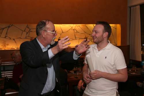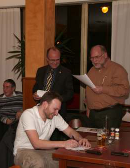 Abb. oben: Unser neuer Finanzvorstand Jan Heldmann (rechts; links sein Vorvorgänger) war derart mit der Kasse beschäftigt (an jenem Abend wurden Barumsätze von über 2.000 € gemacht), dass er auf kaum einem Foto zu sehen war. Er hat es aber verdient, ins rechte Licht gerückt zu werden!